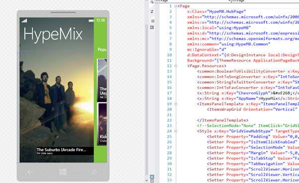 To my absolute delight, this worked and my styles came across. Emboldened by this I picked up the body of my existing Windows 8.1 HubPage.xaml and Ctrl-C, Ctrl-V’d it into a page on the phone. With the exception of about 15 errors relating to slight differences in the XAML, THIS ALSO WORKED! I EVEN GOT MY NICE DESIGN TIME EXPEREINCE!