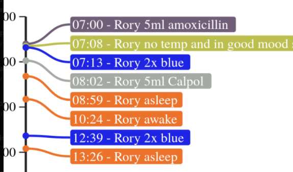 Last was drawing the timelines, labella was awesome here, I had to hack a bit but it does awesome stuff like let you pick a colour for the item based on it’s content. With this I could label different types of medication with different colours on the timeline.