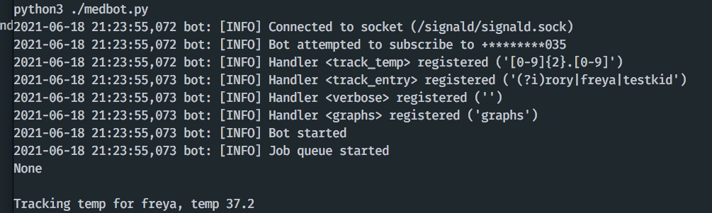 What does this code look like? See the Semaphone examples for a full fledged starting point (seriously they’re awesome). In the meantime, I’ll show my specific bits. It’s surprisingly small, I added a handler to the bot to detect messages that had a temperature in them using a regex and insert them into the temperature table in sqlite.