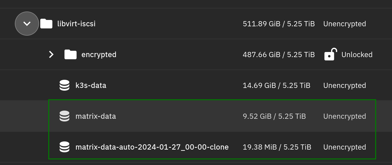 In each of the VMs hosted in the lab I use libvirt’s ISCSI support to mount a ZFS /mnt/data directory in which all the applications state is stored.