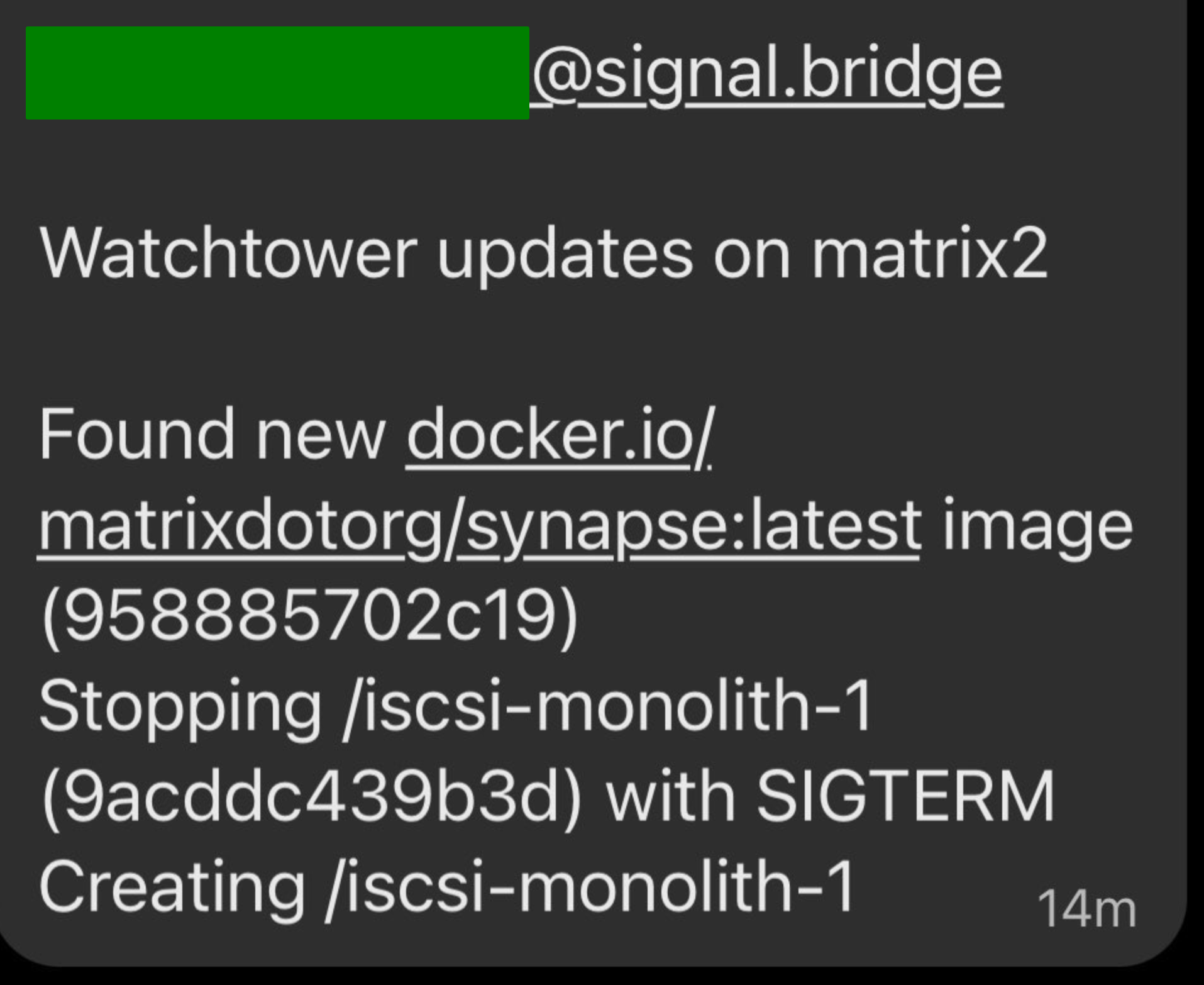 To finish it off, I’ve set it up its notifications, using my SMTP -> Signal bridge, to ping me a note when it does it. That’s it, no more manual update of docker-compose based apps. I get these nice messages on Signal when it updates something: